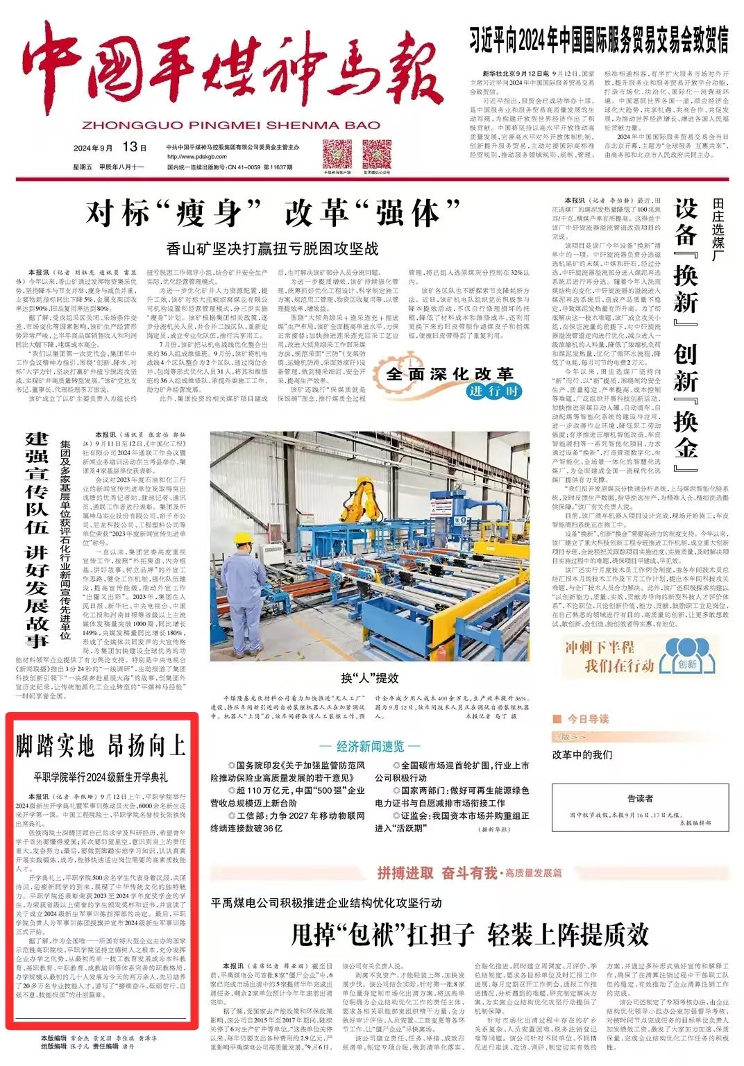 媒体平职|中国平煤神马报:平职学院举行2024级新生开学典礼