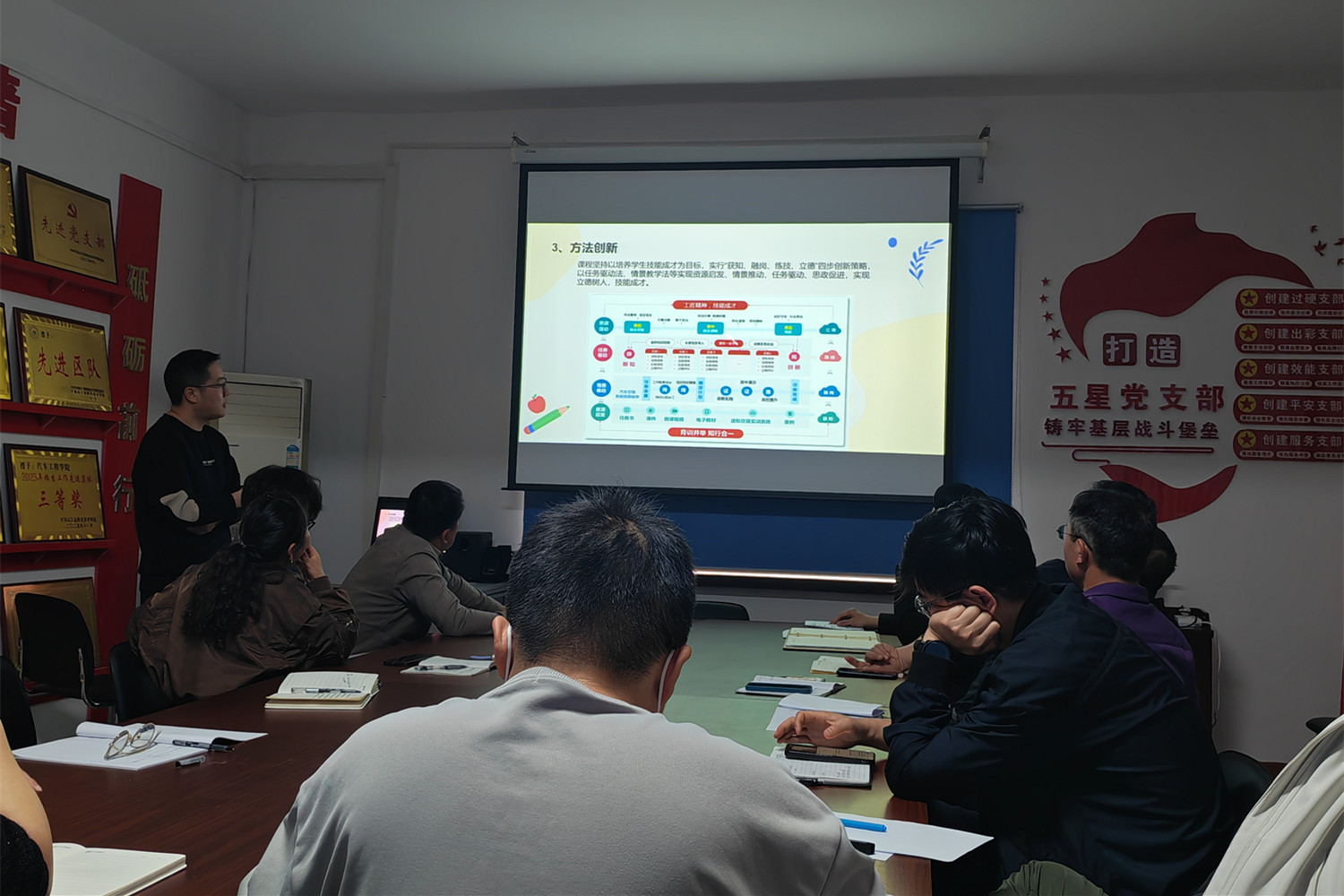 文化教育部开展“说课程”专题教研活动,全体教师参加。活动上,《军事理论》《国家安全教育》《劳动教育与实践》《大学英语》等课程负责人依次汇报,围绕六大维度展示建设成果。汇报结束后,评审小组紧扣“说课程”核心要点精准点评,充分肯定各课程准备充分、逻辑清晰、内容详实,课程建设取得阶段性成效,并针对课程思政深度融入、AI技术与教学融合创新、课程特色精准提炼等方面,提出针对性优化建议。下一步,文化教育部将抓实问题整改,深化教学改革,全面提升课程建设质量与人才培养水平,以扎实成效迎接省级办学能力评价。