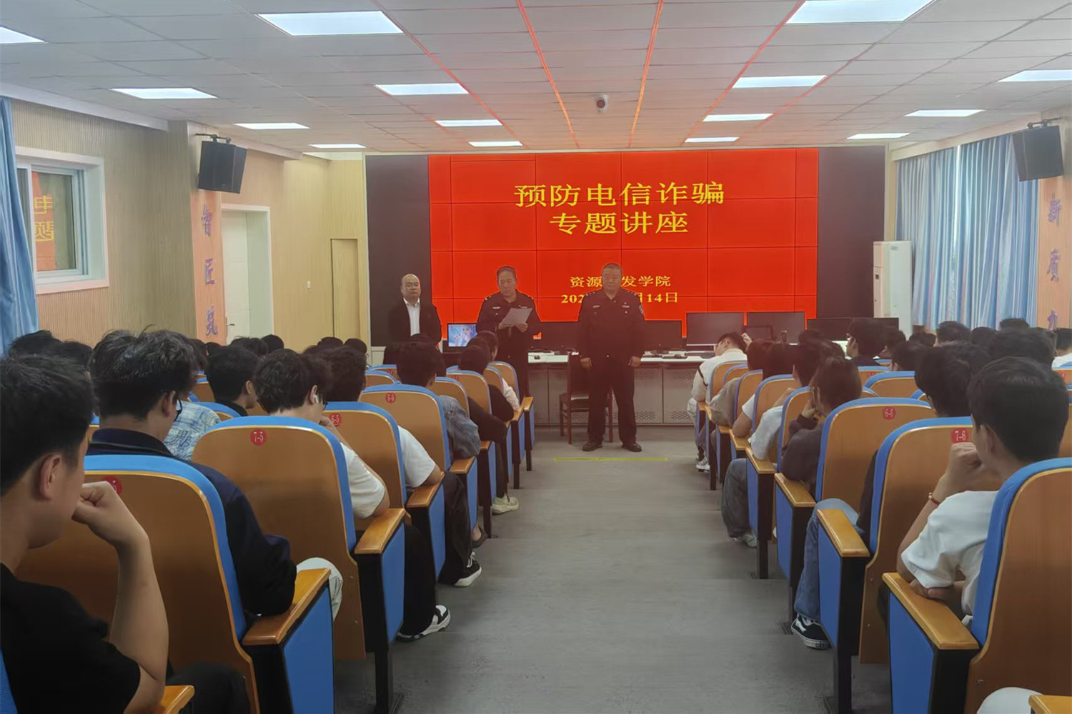4月14日,资源开发学院特邀北渡派出所所长于振淼,在智慧矿山调度中心开展预防电信诈骗专题讲座。学院学工负责人、公安局驻校民警、全体辅导员及各年级学生代表现场聆听。
