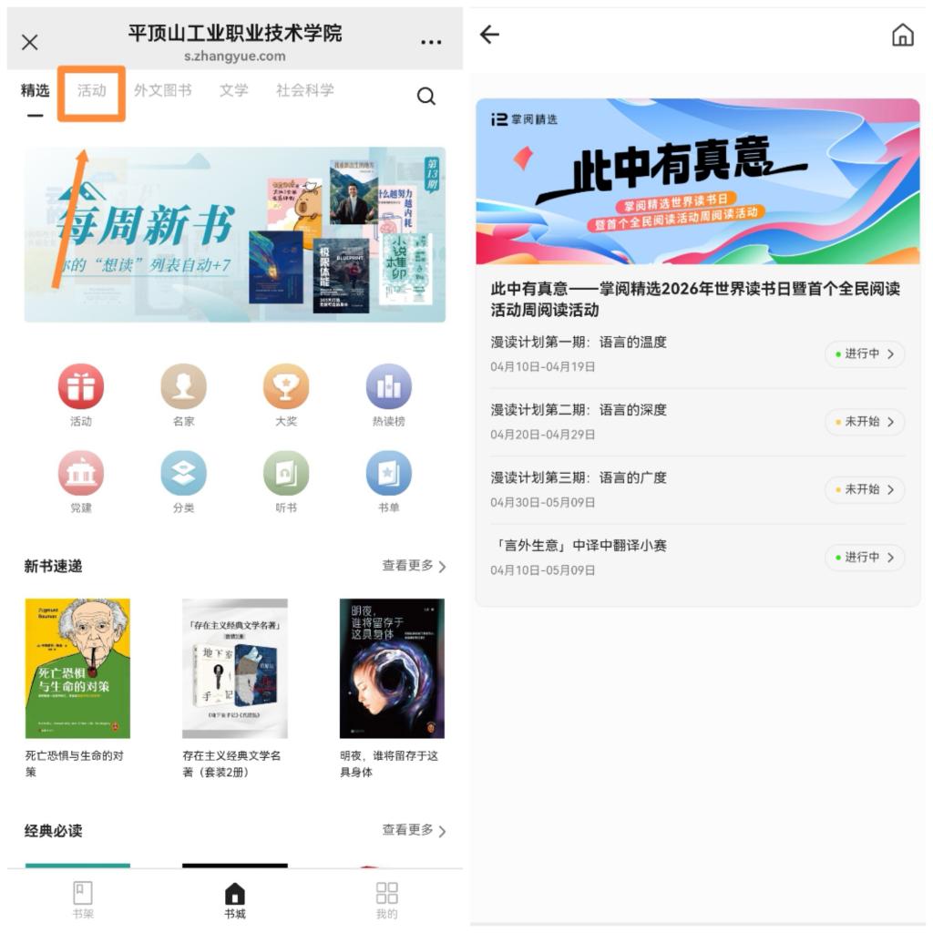 3.点击顶部【活动】进入活动中心,即可参与“此中有真意—2026年世界读书日”阅读活动。关于举办“此中有真意—2026年世界读书日”河南省高校阅读活动的通知。